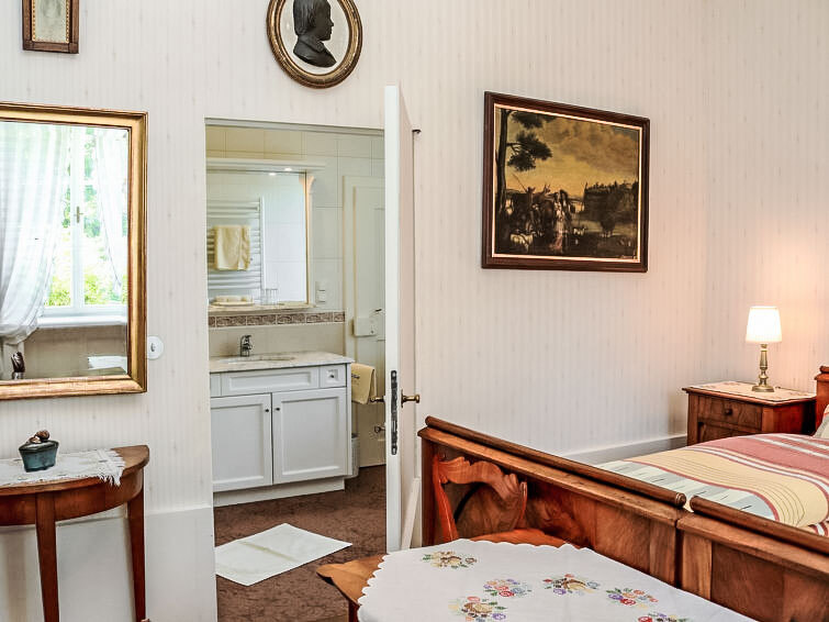 Villa 3-kamers 90 m2 op 2 verdiepingen. Zeer smaakvol en stijlvol ingericht: hal. Woonkamer met tegelkachel. 1 2-pers. kamer met douche/WC. Keuken (4-pits kookplaat, oven, afwasmachine, magnetron) met eethoek. Aparte WC. Bovenverdieping: 1 2-pers. kamer met Kabel-TV. Douche/WC. Vloerverwarming. Terras overdekt. Terrasmeubelen, bergruimte. Mooi uitzicht op de tuin. Ter beschikking: wasmachine. Internet (Internet (WiFi), gratis). Parkeerplaats (overdekt, 2 Auto's) bij het huis. Rookvrij huis. Het meubilair van de Rosenvilla is origineel Biedermeier. Er staat een grote piano in de salon. De afgebeelde tegelkachel dient alleen als een ornament. Vanwege de waardevolle uitrusting zijn kinderen alleen welkom vanaf 10 jaar. Bij reserveringen van meer dan 8 nachten is een tussentijdse schoonmaak verplicht en kost 60 EUR per schoonmaak ter plaatse. Als er minder dan het maximale aantal gasten in de accommodatie verblijft, zijn niet alle wooneenheden beschikbaar voor gebruik.