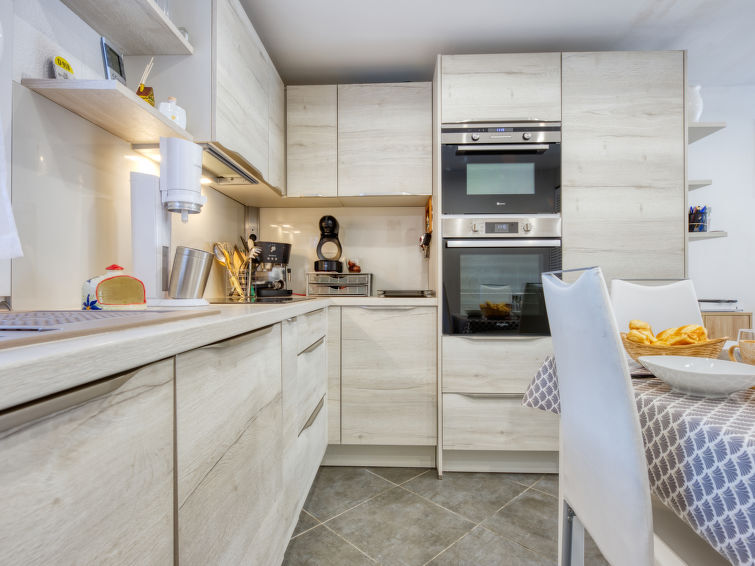 Huis in een rij 3-kamers 50 m2 op 2 verdiepingen, op het zuidoosten gelegen. Het objekt is geschikt voor 2 volwassenen + 2 kinderen. Zeer comfortabel en mooi ingericht: woon-/eetkamer met Sat-TV, Flatscreen TV, radio en air-conditioning. Uitgang naar het terras. Open keuken (oven, afwasmachine, 3 inductiekookplaten, broodrooster, waterkoker, magnetron, diepvriezer, elektrische koffiemachine, pads voor de koffiemachine (Dolce Gusto) extra) met kleine eettafel. Bovenverdieping: 1 kamer met 2 bedden (90 cm, lengte 190 cm). 1 kamer met 1 bed (140 cm, lengte 190 cm). Douche/WC. Elektrische verwarming. Terras 24 m2, op het zuiden gelegen en op het zuidoosten gelegen. Terrasmeubelen, elektrische barbecue, ligstoelen (2). Ter beschikking: wasmachine. Internet (WiFi, gratis). Maximaal 1 huisdier/hond toegestaan. Rookmelders. Aanbod door een particulier volgens art. 155, IV van CGI.