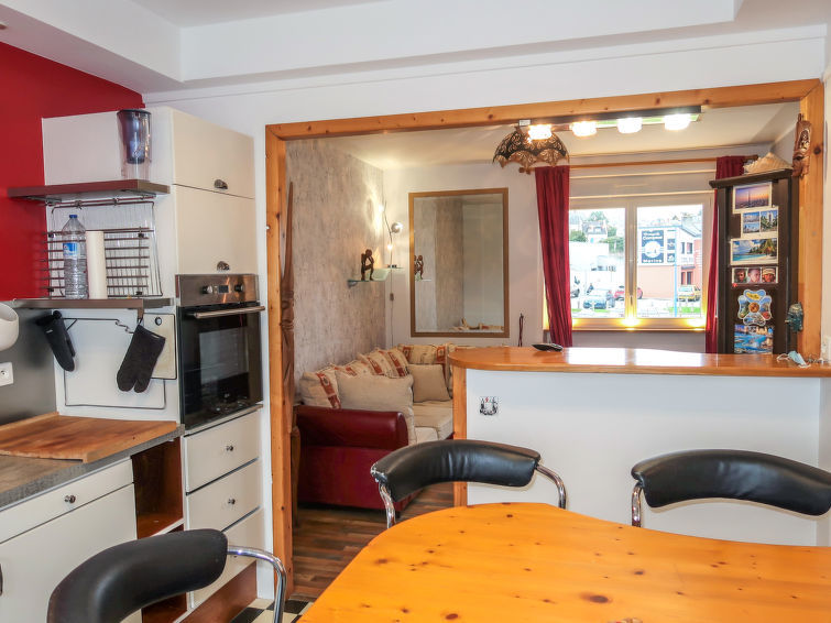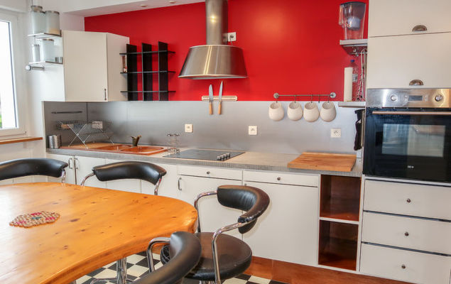 "l'Atlantique", appartement 3-kamers 65 m2 op de 1e verdieping. Gezellig ingericht: woon-/eetkamer met TV (Flatscreen TV). 1 kamer met 1 2-pers bed (160 cm, lengte 200 cm). 1 kamer met 2 bedden (90 cm, lengte 190 cm). Open keuken (afwasmachine, 4 keramische glas kookplaten, broodrooster, waterkoker, magnetron, elektrische koffiemachine) met eettafel. Douche, aparte WC. Elektrische verwarming. Ter beschikking: wasmachine, droger, kinderbed tot 2 jaar. Internet (Internet (WiFi), gratis). Let op: niet rokers woning. 1 klein huisdier/hond toegestaan. Rookmelders.
