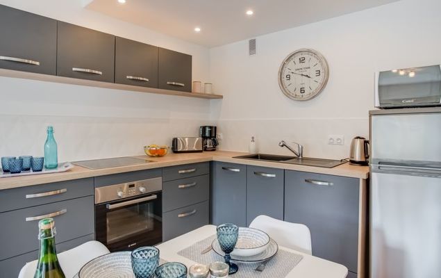 Appartement 2-kamers 52 m2, op verhoogde begane grond. Volledig gerenoveerd in 2020, comfortabel ingericht: woon-/eetkamer met panoramavenster met 1 2-pers divanbed (140 cm, lengte 190 cm), TV (Flatscreen TV). Uitgang naar het balkon. 1 kamer met panoramavenster met 1 2-pers bed (1 x 180 cm, lengte 200 cm). Uitgang naar het balkon. Open keuken (oven, afwasmachine, 3 inductiekookplaten, magnetron, diepvriezer, elektrische koffiemachine). Douche, aparte WC. Elektrische verwarming. 2 balkons 5 m2. Terrasmeubelen. Zijdelings uitzicht op zee. Ter beschikking: wasmachine. Parkeerplaats nr. 41. Let op: 1 huisdier/hond toegestaan. Rookmelders.
