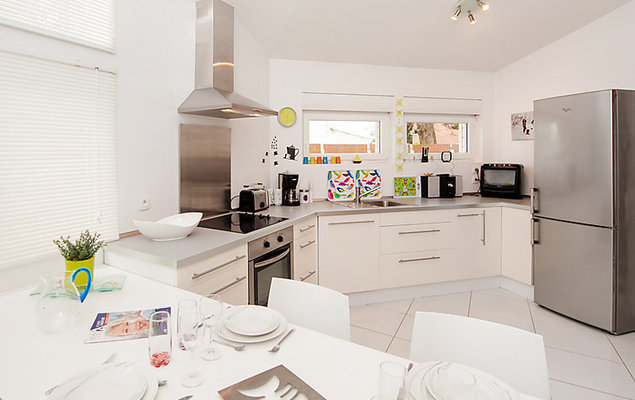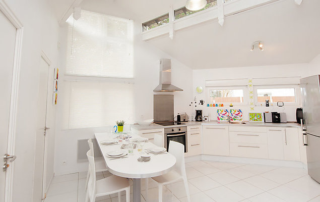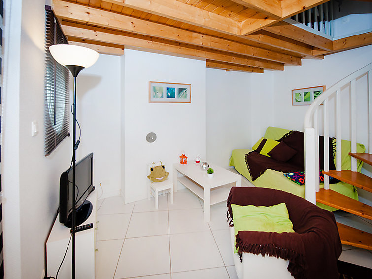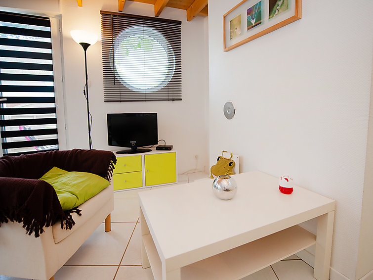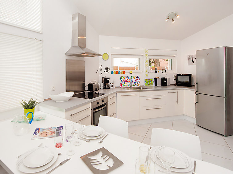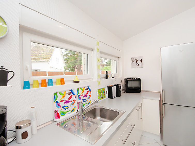 Huis 2-kamers 45 m2 op 2 verdiepingen. Mooi ingericht: woon-/eetkamer met TV en DVD. Uitgang naar het terras. 1 kamer met 1 2-pers bed (140 cm). Open keuken (4-pits kookplaat, oven, afwasmachine, magnetron) met radio. Douche, aparte WC. Bovenverdieping: (wenteltrap) galerij met 1 2-pers divanbed. Elektrische verwarming. Klein terras 5 m2, op het zuidoosten gelegen. Terrasmeubelen, barbecue. Ter beschikking: wasmachine, strijkijzer, kinderbed tot 2 jaar. Internet (Internet (WiFi), extra). Let op: maximaal 1 huisdier/hond toegestaan. Rookmelders.