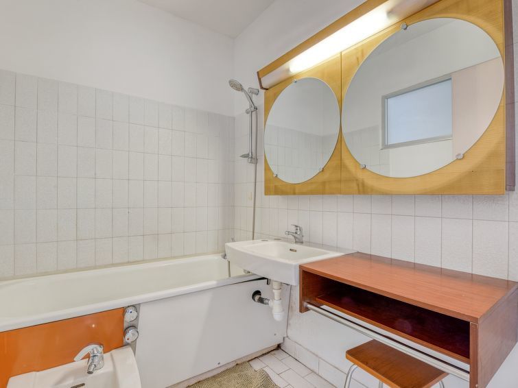Appartement 2-kamers 41 m2 op de 1e verdieping. Woon-/eetkamer met 1 2-pers divanbed (140 cm, lengte 190 cm), TV (Flatscreen TV). Uitgang naar het terras. 1 kleine kinderkamer met 2 bedden (90 cm, lengte 190 cm). Keuken (4-pits kookplaat, diepvriezer, elektrische koffiemachine, combimagnetron). Badkamer, bidet, aparte WC. Terras 9 m2, op het noorden gelegen. Terrasmeubelen. Ter beschikking: Internet (Internet (WiFi), extra). Parkeerplaats nr. 130. Let op: rookmelders.