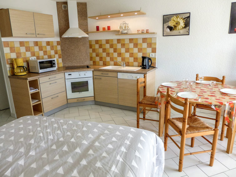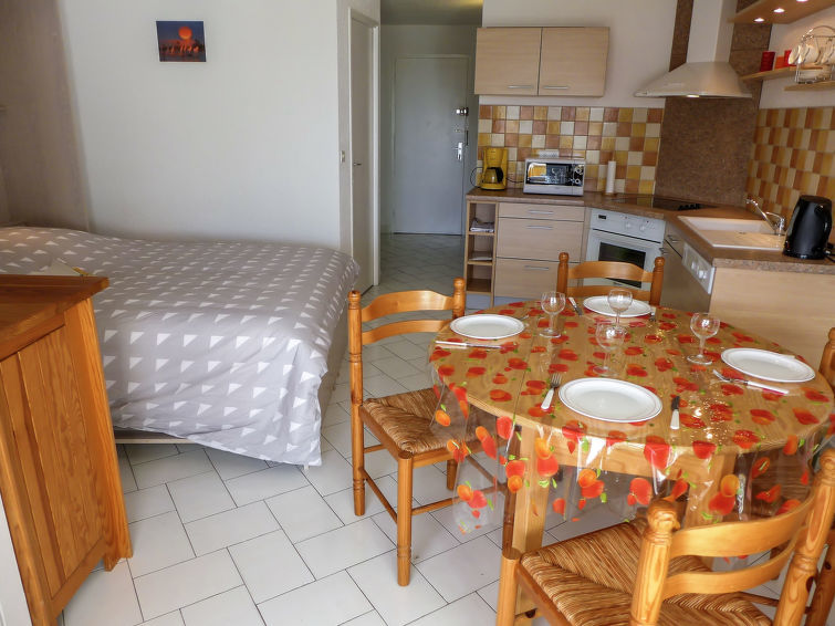 Studio 1-kamer 28 m2 op de 2e verdieping. Het objekt is geschikt voor 2 volwassenen + 2 kinderen. Comfortabel ingericht: woon-/eetkamer met 1 kastbed (140 cm, lengte 190 cm), TV (Flatscreen TV). Cabine met 1 x 2 stapelbedden (80 cm, lengte 190 cm). Open keuken (oven, afwasmachine, 4 keramische glas kookplaten, broodrooster, waterkoker, magnetron, diepvriezer, elektrische koffiemachine). Badkamer, aparte WC. Terras 8 m2, op het zuiden gelegen. Terrasmeubelen. Uitzicht op de tuin. Ter beschikking: Internet (Internet (WiFi), extra). Parkeerplaats. Let op: maximaal 1 klein huisdier/hond toegestaan. Rookmelders.