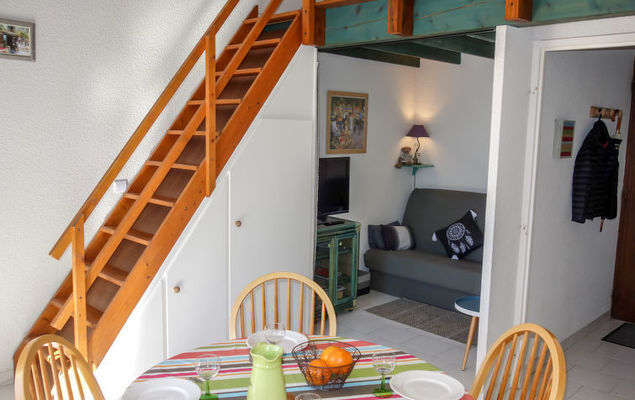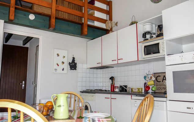 Appartement 1-kamer 25 m2 op de 1e verdieping. Woon-/eetkamer met TV (Flatscreen TV). Woonkeuken (2-pits kookplaat, oven, magnetron, diepvriezer, elektrische koffiemachine) met eettafel. Uitgang naar het terras. Douche/WC. Bovenverdieping: galerij met 1 2-pers bed (1 x 140 cm, lengte 190 cm). Groot terras 14 m2, op het zuiden gelegen. Terrasmeubelen. Ter beschikking: wasmachine. Internet (Internet (WiFi), extra). Parkeerplaats nr. 50. Let op: niet rokers woning. Rookmelders.