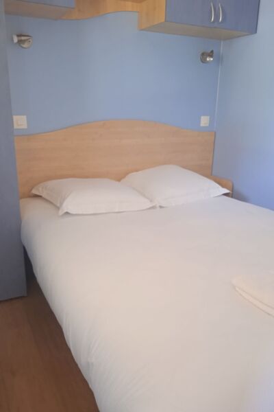 3-kamers mobilhome 25 m2. Doelmatig ingericht: woon-/slaapkamer met 1 slaapplaats en TV (Flatscreen TV). 1 kamer met 1 2-pers bed (1 x 140 cm, lengte 190 cm). 1 kamer met 2 bedden (80 cm, lengte 190 cm). Kookhoek (4-pits kookplaat, broodrooster, waterkoker, magnetron, elektrische koffiemachine). Douche, aparte WC. Elektrische verwarming. Terras. Terrasmeubelen. Maximaal 2 huisdieren/honden toegestaan. Rookmelders. Aanbod door een commerciële eigenaar volgens art. 155, IV, CGI