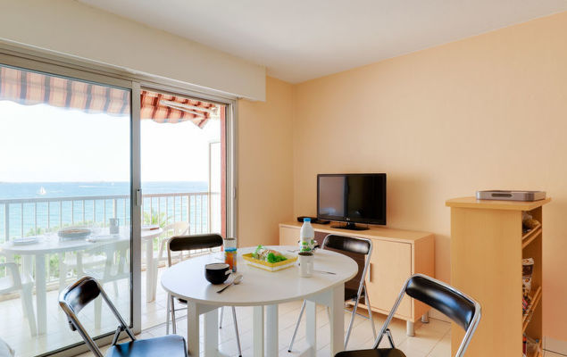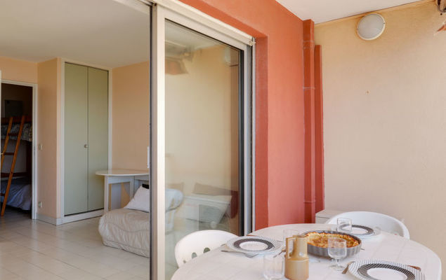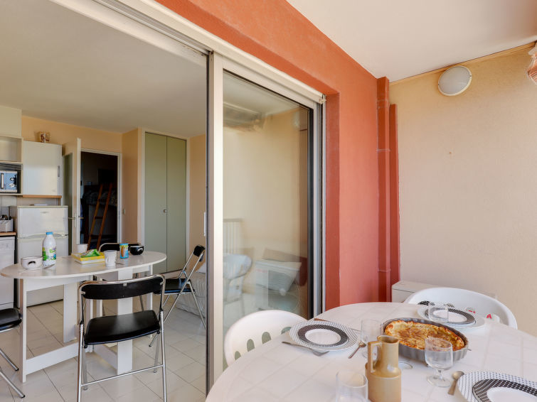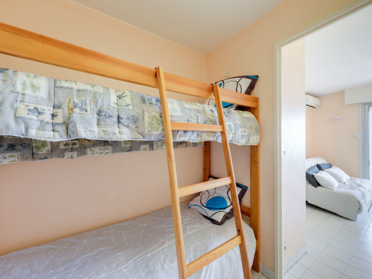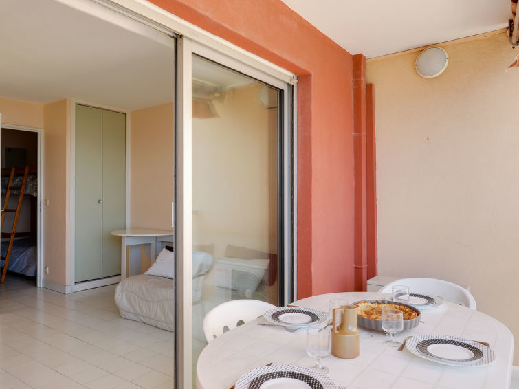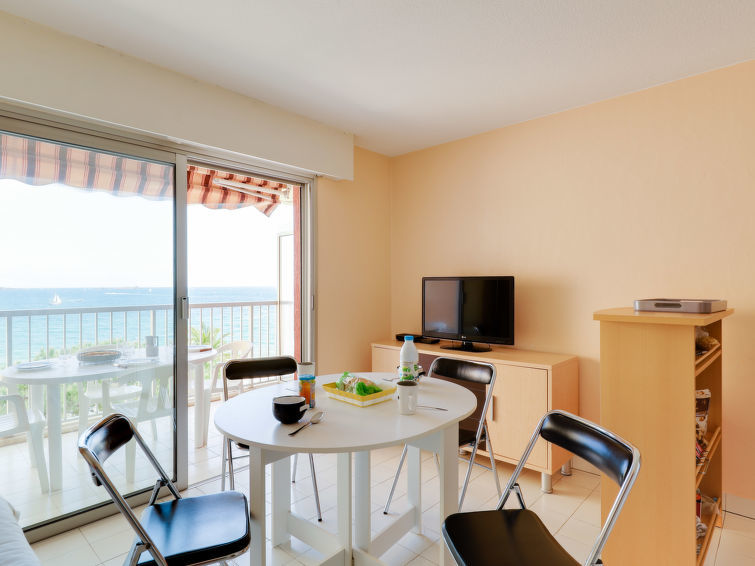 Studio 1-kamer 22 m2 op de 3e verdieping. Het objekt is geschikt voor 2 volwassenen + 2 kinderen. Woon-/eetkamer met 1 2-pers divanbed (1 x 160 cm, lengte 190 cm), TV, air-conditioning en elektrische rolluiken. Uitgang naar het terras. Slaapnis met 1 x 2 stapelbedden (70 cm, lengte 190 cm). Open keuken (afwasmachine, 2 inductiekookplaten, magnetron, diepvriezer, elektrische koffiemachine). Badkamer, aparte WC. Terras. Terrasmeubelen. Mooi uitzicht op zee. Ter beschikking: wasmachine. Internet (Internet (WiFi), gratis). Let op: niet rokers woning. TV alleen FR. Rookmelders.