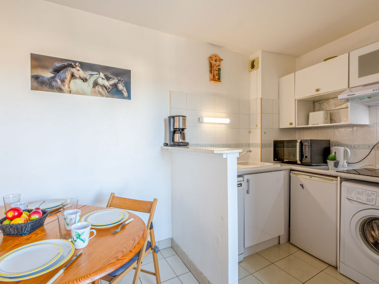 Studio 1-kamer 30 m2 op de 5e verdieping. Het objekt is geschikt voor 2 volwassenen + 2 kinderen. Mooi ingericht: woonkamer met 1 2-pers divanbed (1 x 140 cm, lengte 190 cm), TV (Flatscreen TV). Uitgang naar het terras. Cabine met 1 x 2 stapelbedden (80 cm, lengte 190 cm). Kookhoek (4-pits kookplaat, afwasmachine, broodrooster, waterkoker, elektrische koffiemachine, combimagnetron). Douche/WC. Elektrische verwarming. Groot balkon 6 m2. Balkonmeubilair. Uitzicht in de verte op de bergen. Ter beschikking: wasmachine, strijkijzer. Internet (WiFi, extra). Parkeerplaats nr. 43 (overdekt, 1 Auto), hoogte 190 cm, breedte 240 cm. Woning aan de straatzijde. Niet rokers woning. Maximaal 1 huisdier/hond toegestaan. TV alleen FR. Rookmelders. In plaats van een afgesloten slaapkamer bevinden sommige slaapgedeeltes zich in een open ruimte (galerij, nis, etc.).