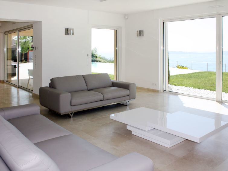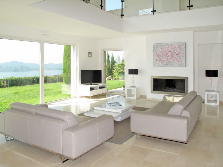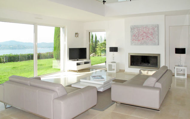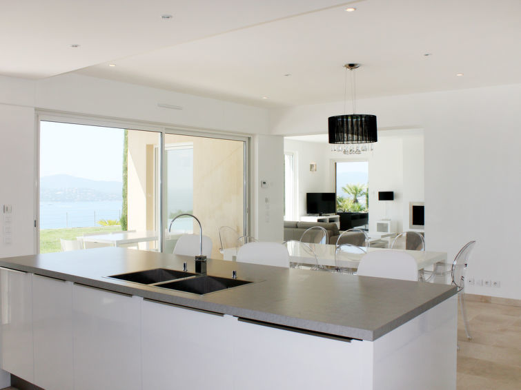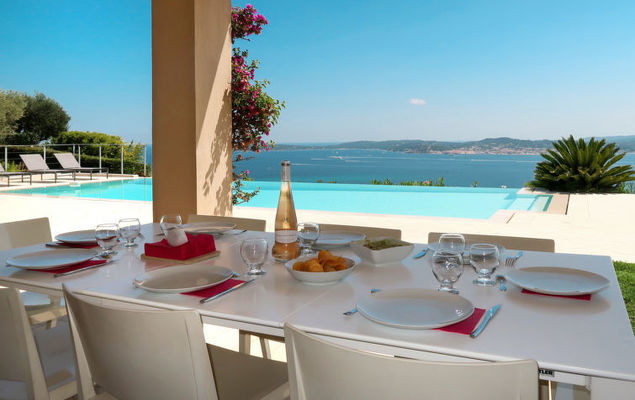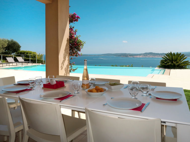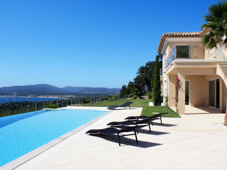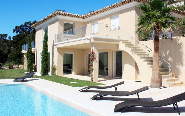 Moderne villa "Lei Suve". 10 km van het centrum van Grimaud, 4.5 km van het centrum van Sainte Maxime, 12 km van het centrum van Saint Tropez, villa wijk, 1.4 km van zee. Voor alleengebruik: terrein 1.550 m2 (omheind), verzorgde tuin op verschillende niveaus, openluchtzwembad (12 x 5 m, seizoensgebonden beschikbaarheid: 01.Jan.-31.Dec.) met alarminstallatie en zout-elektrolyse. Buitendouche, jeu de boules. 30 m lange steile toegangsweg. Parkeerplaats (voor 3 auto's) op het terrein. Winkel 4.5 km, zandstrand "Beauvallon" 1.4 km. Golfterrein (18 holes) 2 km.