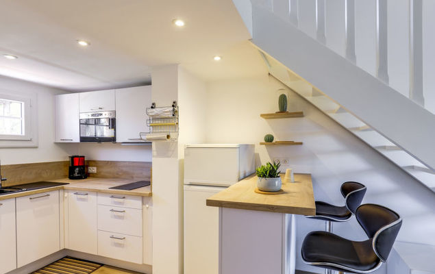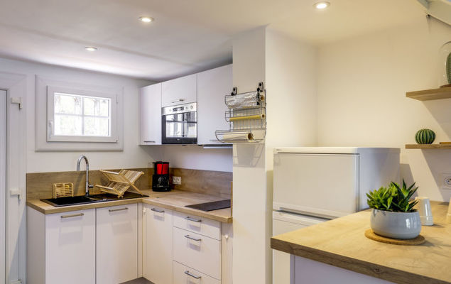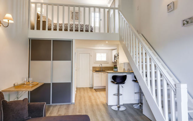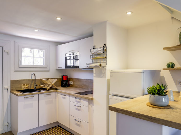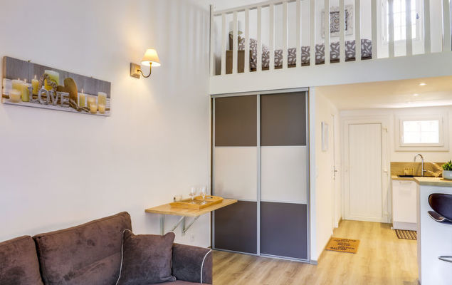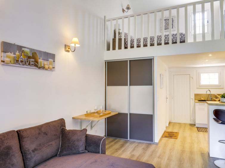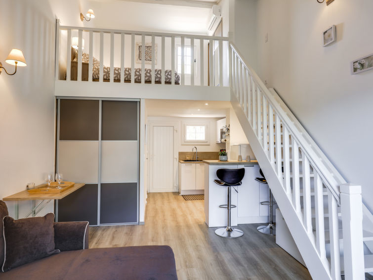 Studio 1-kamer 45 m2 op 2 verdiepingen op de 1e verdieping. Comfortabel en modern ingericht: woon-/eetkamer met 1 divanbed (140 cm, lengte 200 cm), TV. Uitgang naar het balkon. Open keuken (afwasmachine, 2 inductiekookplaten, broodrooster, waterkoker, diepvriezer, elektrische koffiemachine, combimagnetron). Douche/WC. Air-conditioning. Bovenverdieping: open galerij met 1 2-pers bed (160 cm, lengte 200 cm). Balkon 7 m2, op het oosten gelegen. Balkonmeubilair. Uitzicht op zee. Ter beschikking: wasmachine. Internet (Internet (WiFi), gratis). Parkeerplaats nr. 4022. Let op: niet rokers woning. Rookmelders. 8310700014822