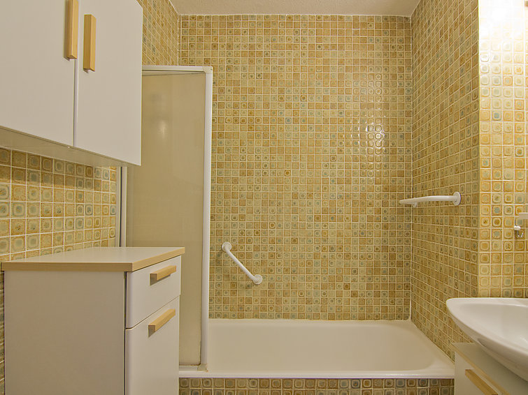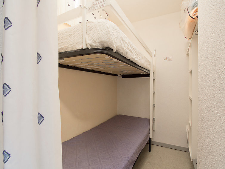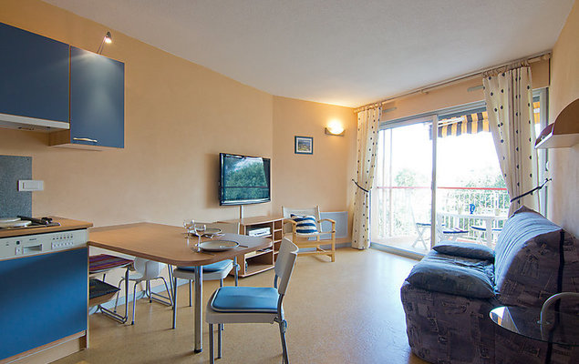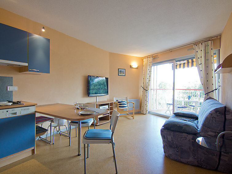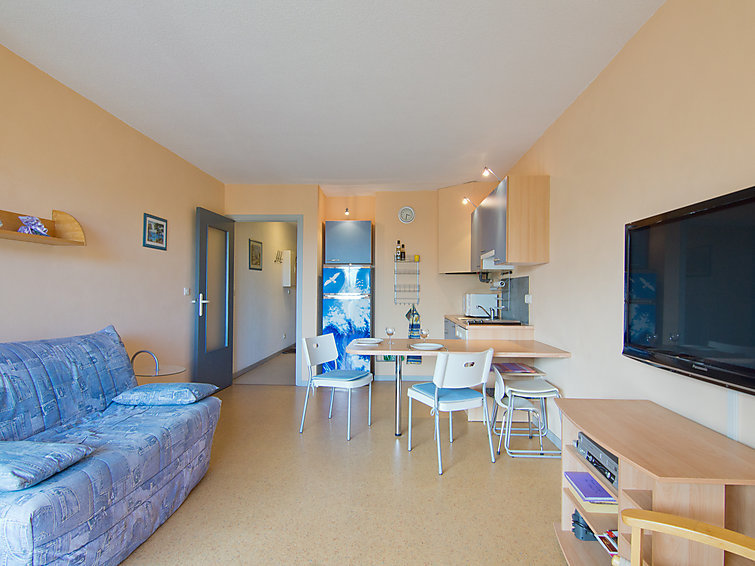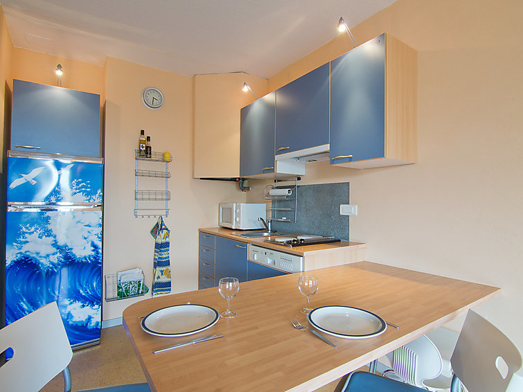 Studio 1-kamer 30 m2 op de 2e verdieping. Gedeeltelijk gerenoveerd in 2022, comfortabel en mooi ingericht: woon-/eetkamer met panoramavenster met 1 2-pers divanbed (1 x 140 cm, lengte 190 cm), TV, radio, air-conditioning en ventilator. Uitgang naar het terras. Cabine met 1 bed (80 cm, lengte 190 cm), ventilator. Kookhoek (2-pits kookplaat, afwasmachine, broodrooster, waterkoker, diepvriezer, elektrische koffiemachine, combimagnetron). Bad/WC. Elektrische verwarming. Terras 6 m2 gedeeltelijk overdekt. Terrasmeubelen. Beperkt uitzicht op zee. Ter beschikking: wasmachine, strijkijzer, haardroger. Internet (Internet (WiFi), extra). Parkeerplaats nr. 147. Let op: TV alleen FR. Rookmelders.