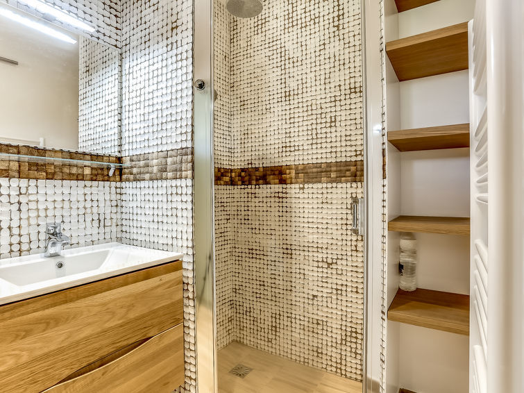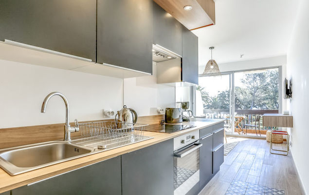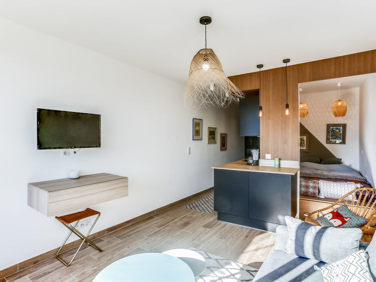 Appartement 1-kamer 28 m2 op de 1e verdieping. Gerenoveerd in 2017, mooi ingericht: woon-/eetkamer met panoramavenster met 1 2-pers bed (1 x 140 cm, lengte 190 cm), TV (Flatscreen TV), air-conditioning en elektrische rolluiken. Uitgang naar het terras. Open keuken (oven, 3 inductiekookplaten, broodrooster, waterkoker, magnetron, elektrische koffiemachine). Douche/WC. Terras 6 m2. Terrasmeubelen. Ter beschikking: haardroger. Internet (Internet (WiFi), gratis). Parkeerplaats nr. 15. Let op: koelkast zonder vriesvak. TV alleen FR. Rookmelders.