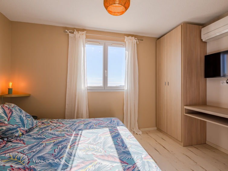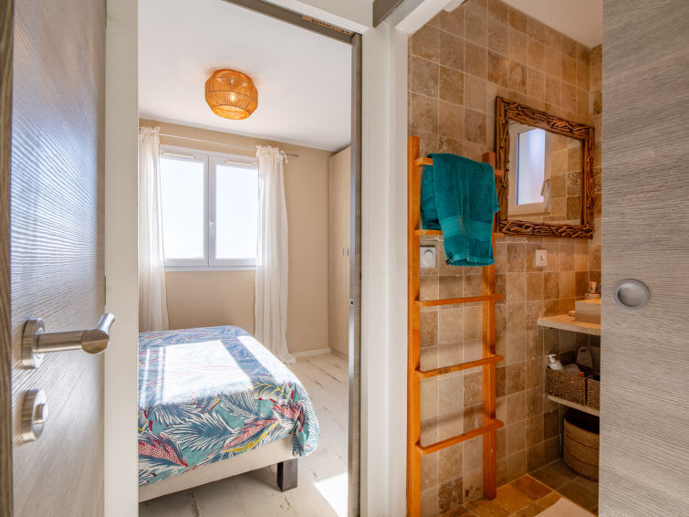 "Le Bougainvillier", huis in een rij 3-kamers 48 m2 op 2 verdiepingen, op het zuiden gelegen. Het objekt is geschikt voor 2 volwassenen + 2 kinderen. Gerenoveerd in 2024, modern en smaakvol ingericht: woon-/eetkamer 22 m2 met veranda met TV (Flatscreen TV), air-conditioning. Uitgang naar de loggia. Open keuken (oven, afwasmachine, 4 keramische glas kookplaten, broodrooster, waterkoker, magnetron, diepvriezer, elektrische koffiemachine). Bovenverdieping: 1 kamer 10 m2 met 1 2-pers bed (1 x 160 cm, lengte 200 cm). 1 kamer 7 m2 met 1 uitschuifbaar bed (2 pers. 2 x 80 cm, lengte 200 cm), air-conditioning. Douche, aparte WC. Verwarming, air-conditioning. Balkonmeubilair, elektrische barbecue, loggia. Uitzicht in de verte op zee en Golfbaan. Ter beschikking: wasmachine. Internet (Internet (WiFi), gratis). Garage (1 Auto). Rookvrij huis. Rookmelders. Aanbod door een commerciële eigenaar volgens art. 155, IV, CGI 83115005475MX