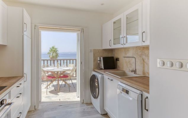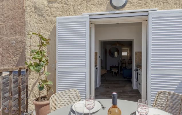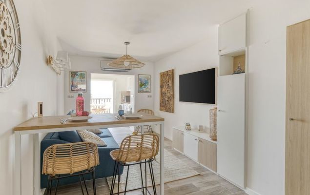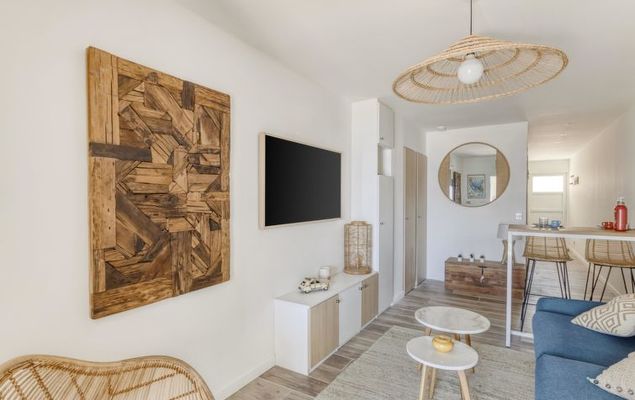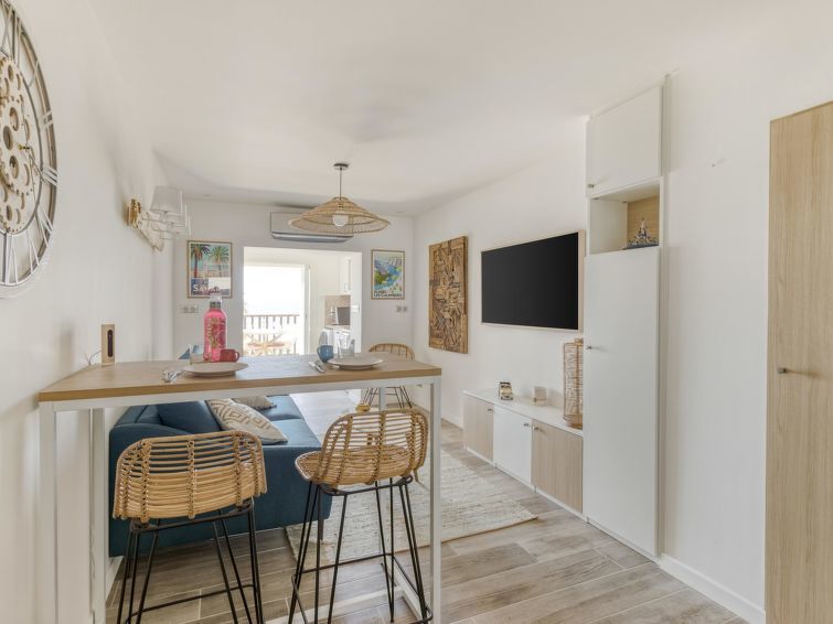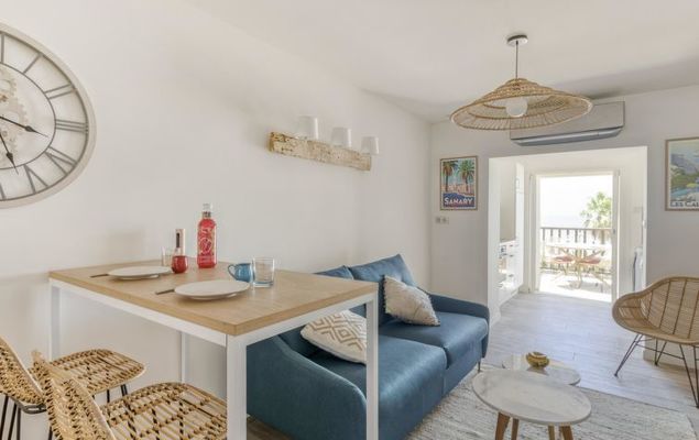 Studio 1-kamer 37 m2, op verhoogde begane grond. Licht, volledig gerenoveerd in 2021, comfortabel en mooi ingericht: hal, zonder ramen met 1 2-pers bed (140 cm, lengte 190 cm). Woon-/eetkamer met TV (Flatscreen TV). Uitgang naar het terras. Kookhoek (afwasmachine, 4 inductiekookplaten, broodrooster, waterkoker, elektrische koffiemachine, combimagnetron). Douche/WC. Air-conditioning. Terras 7 m2. Terrasmeubelen. Panoramazicht op zee. Ter beschikking: wasmachine, droger. Internet (Internet (WiFi), gratis). Parkeerplaats. Let op: TV alleen FR. Rookmelders.