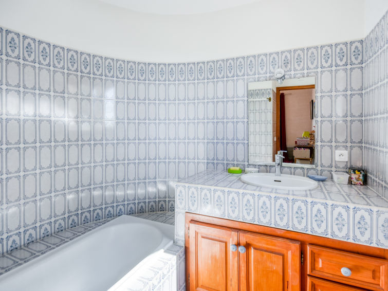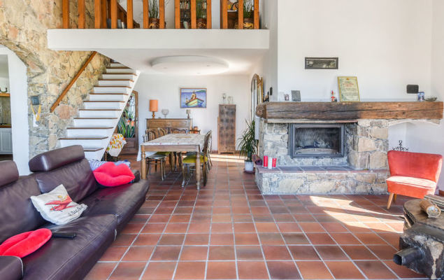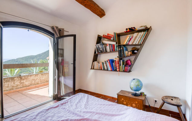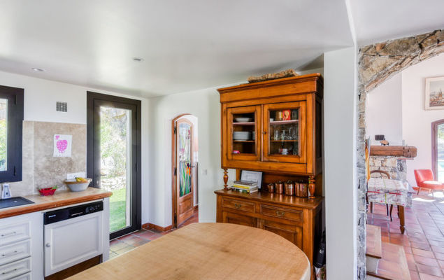 Villa 5-kamers 180 m2 op 4 verdiepingen. Zeer mooi en rustiek ingericht: woon-/eetkamer met open haard en TV (Flatscreen TV). Uitgang naar het terras, naar het zwembad. Open keuken (2-pits kookplaat, oven, afwasmachine, magnetron, diepvriezer, grill, elektrische koffiemachine) met TV (Flatscreen TV). Uitgang naar de zitplaats in de tuin. 2 aparte WC's. Souterrain: 1 kamer met 1 2-pers bed (160 cm, lengte 200 cm), douche en dubbele wastafels. Uitgang naar het terras. 1 kamer met 1 bed (80 cm, lengte 180 cm), bad. Uitgang naar het terras. Bovenverdieping: 1 kamer met 1 bed (140 cm, lengte 190 cm), bad. Zolderverdieping: (steile trap) open bureau. 1 kamer met 1 2-pers bed (160 cm, lengte 190 cm). Uitgang naar het balkon. Elektrische verwarming. Groot terras 200 m2. Terrasmeubelen, barbecue, ligstoelen (6). Mooi uitzicht op zee, de bergen en het dal. Ter beschikking: wasmachine, droger, strijkijzer, haardroger. Let op: TV alleen FR. Rookmelders.