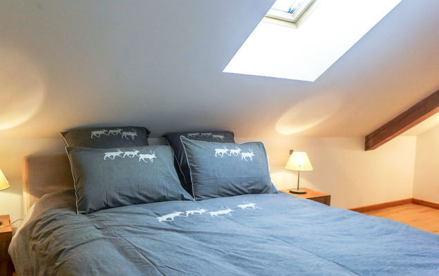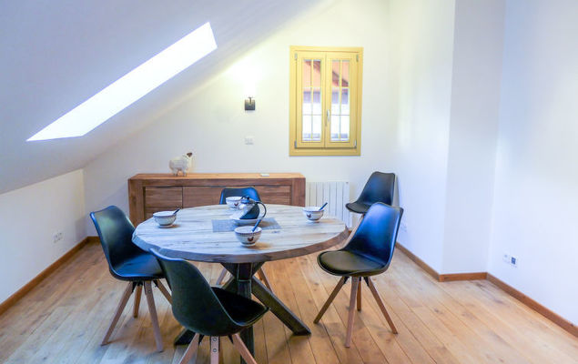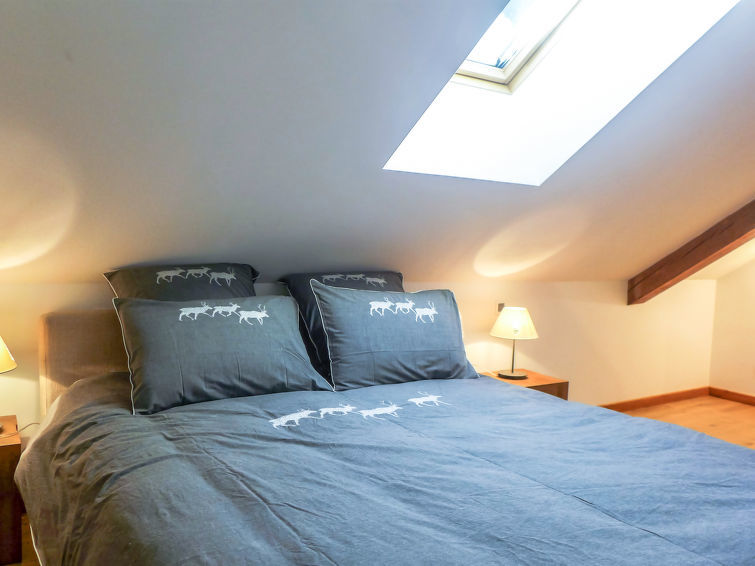 Dakappartement 3-kamers 55 m2 op de 2e verdieping. Afgeschuinde daken, modern ingericht: woonkamer met TV. 1 kamer met dakraam met 1 2-pers bed (160 cm, lengte 200 cm). 1 kamer met dakraam met 2 bedden (90 cm, lengte 190 cm). Eetkamer met dakraam. Open keuken (oven, afwasmachine, 2 keramische glas kookplaten, waterkoker, magnetron, elektrische koffiemachine). Badkamer, aparte WC, hydro massage bad. Elektrische verwarming. Beperkt uitzicht op de bergen. Ter beschikking: wasmachine. Internet (Internet (WiFi), gratis). Parkeerplaats. Let op: rookvrij huis. TV alleen FR. Rookmelders.
